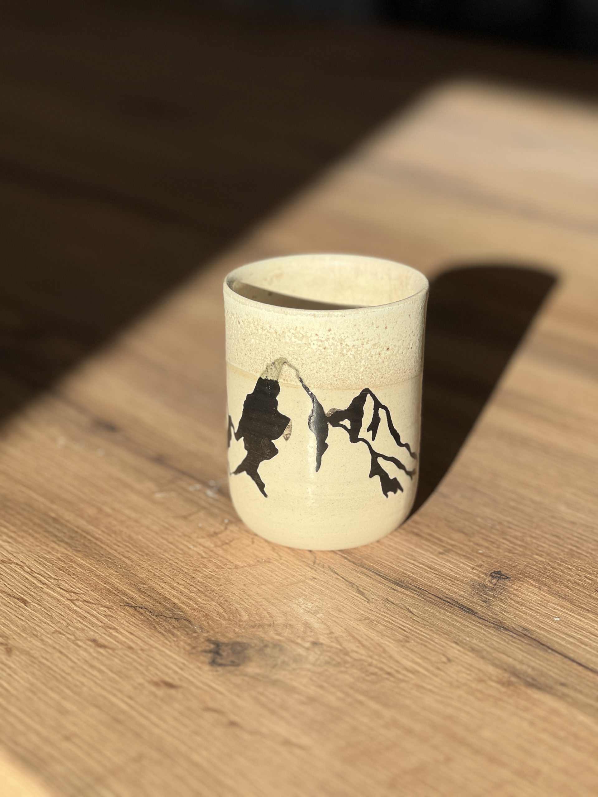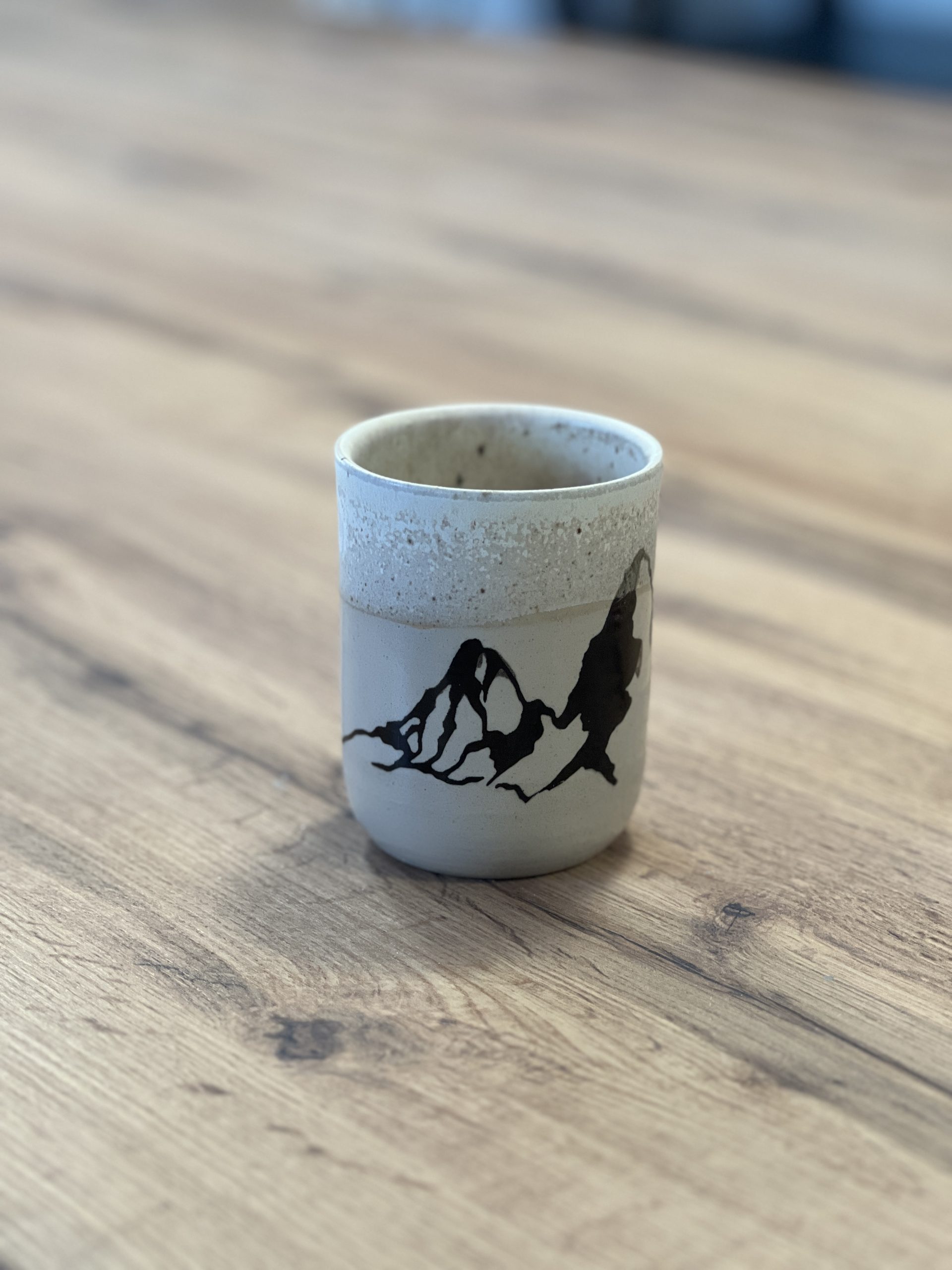 Ręcznie toczony na kole kubek ceramiczny o pojemności ok. 300 ml, inspirowany górskimi pejzażami.