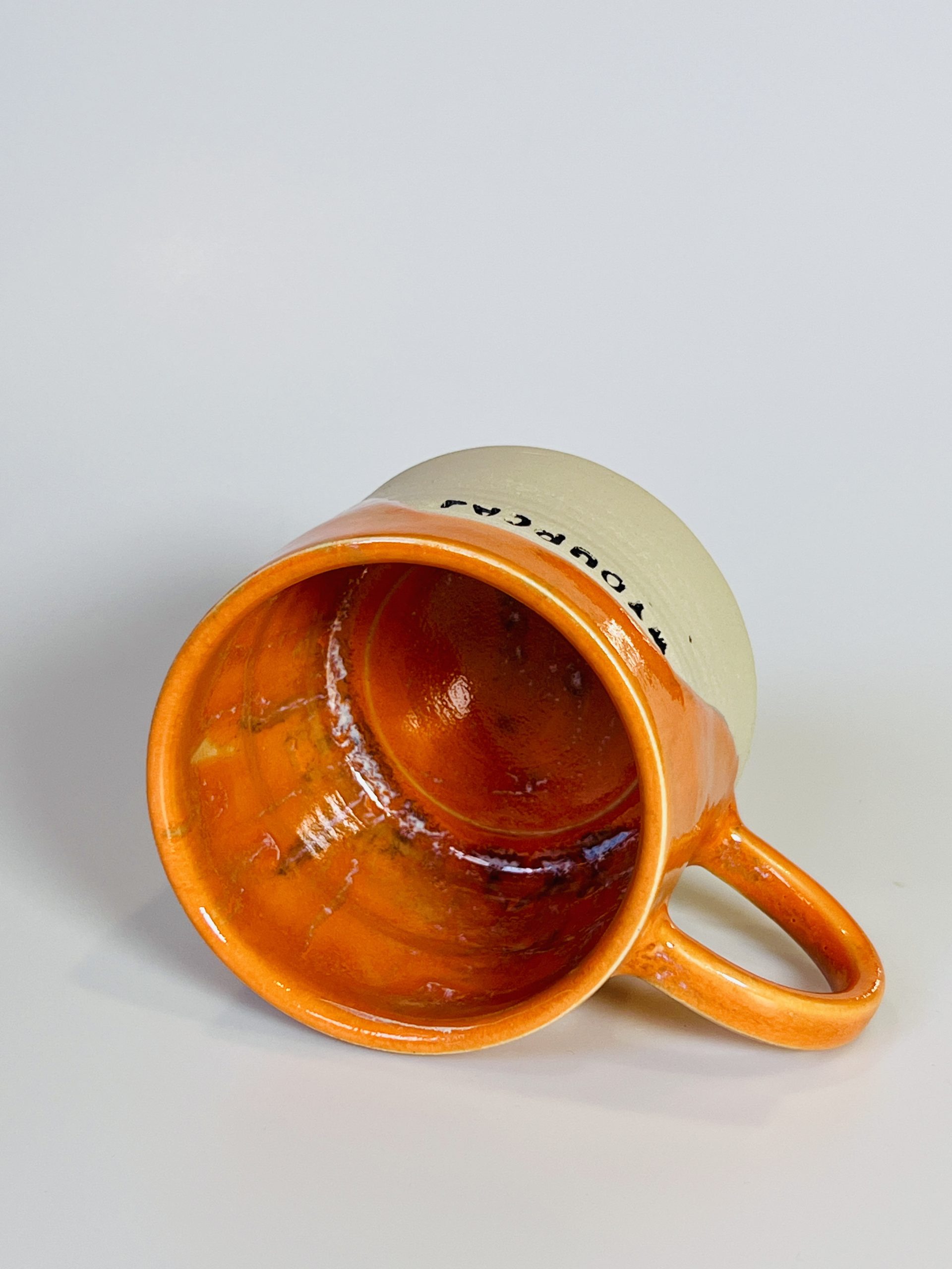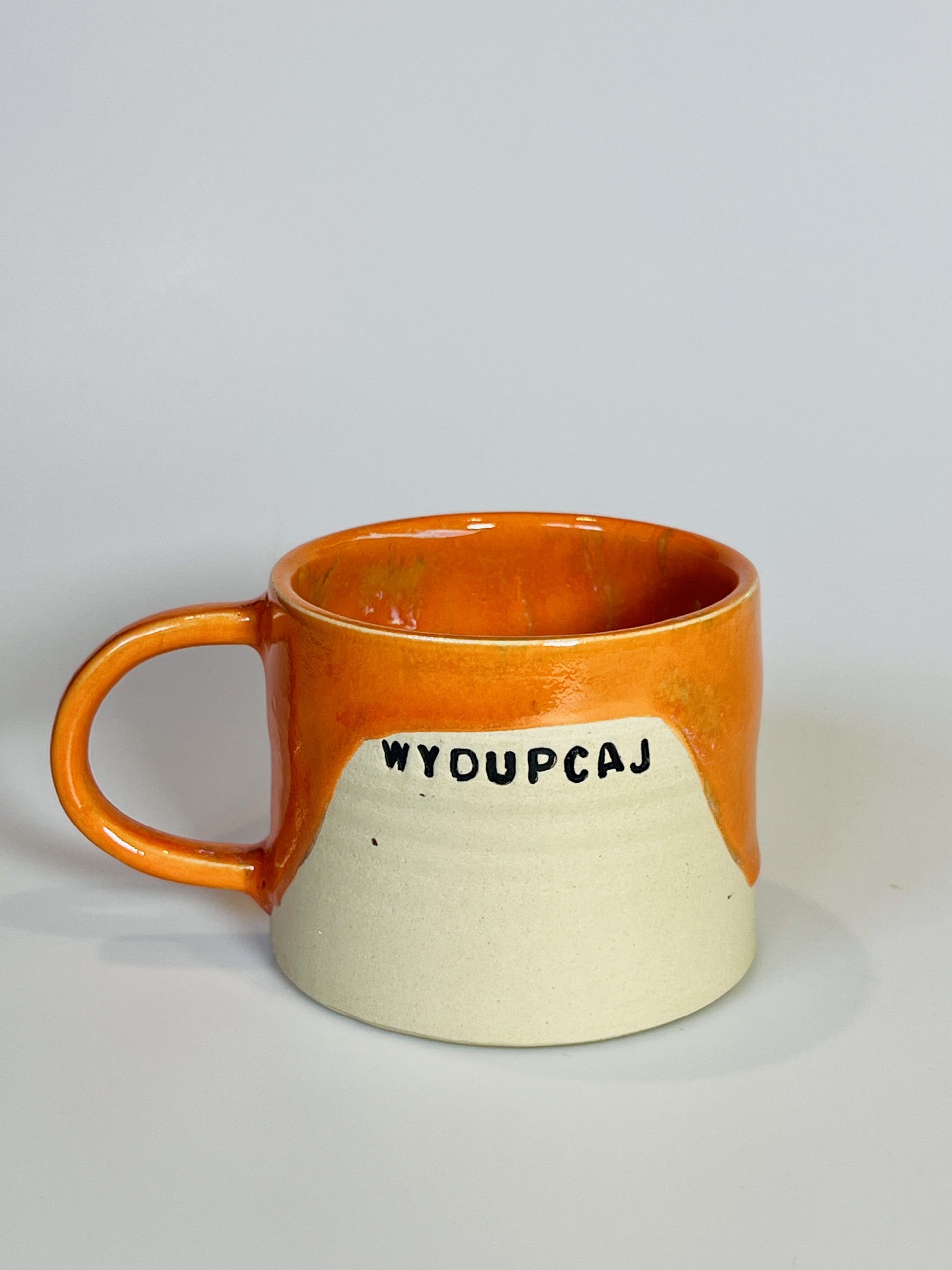 Ceramiczny kubek 300 ml w intensywnie pomarańczowym szkliwie z napisem „WYDUPCAJ” — mały, wyrazisty i idealny na prezent z pazurem.