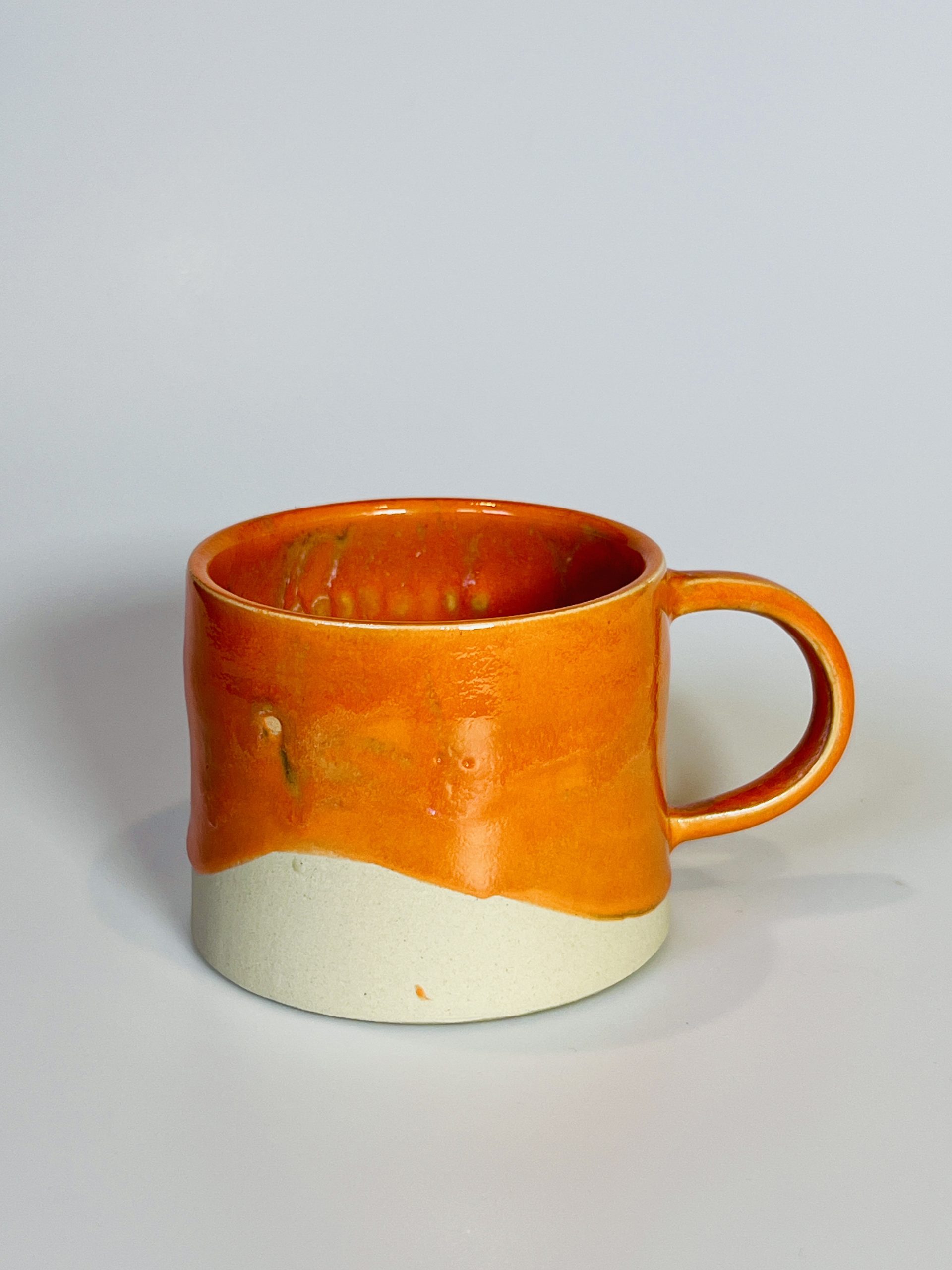 Soczyste pomarańczowe szkliwo z naturalną, jasną gliną na dole wygląda jak zachód słońca w wersji ceramicznej, a wnętrze ma piękne, ręcznie szkliwione „smugi”