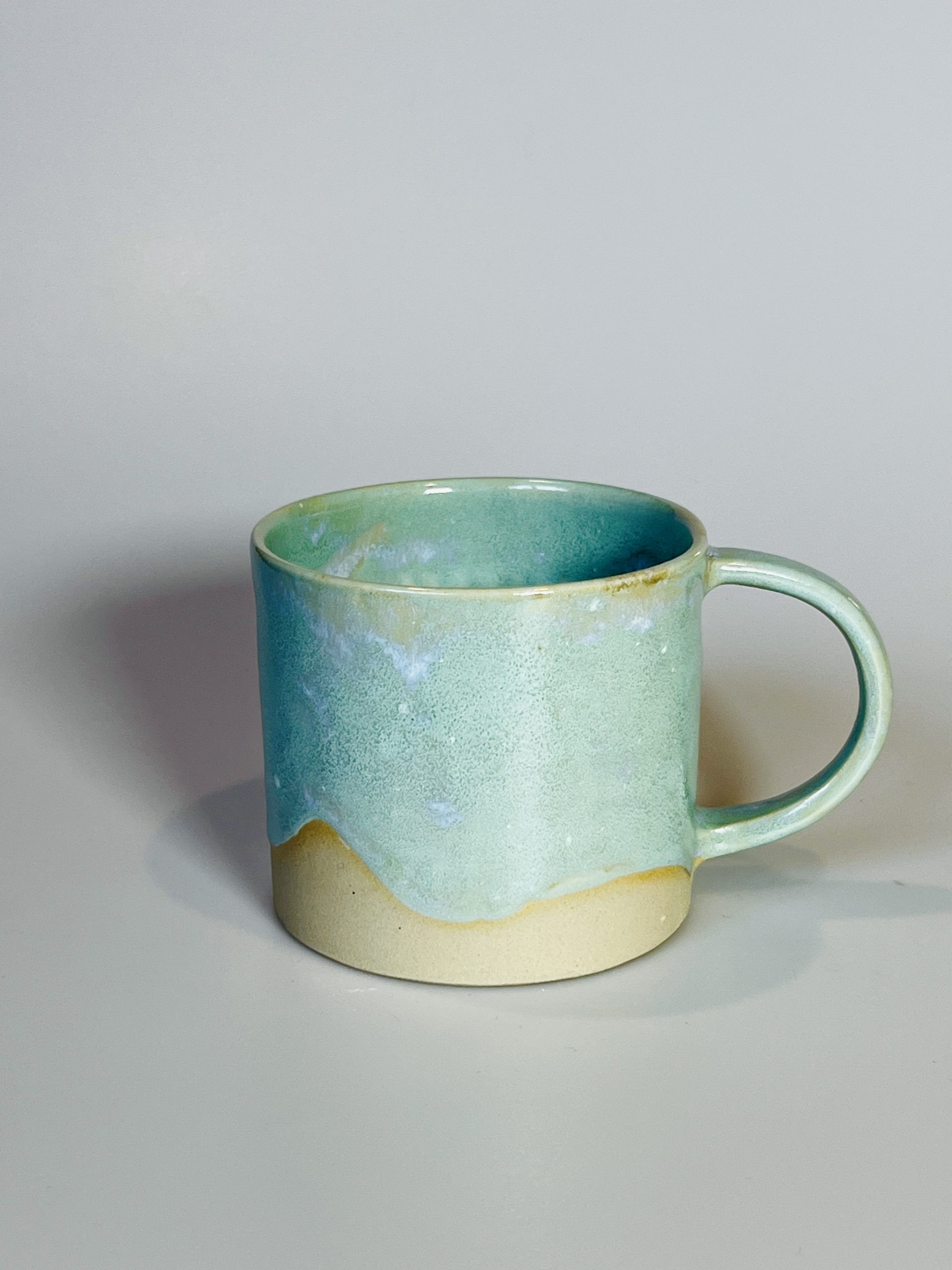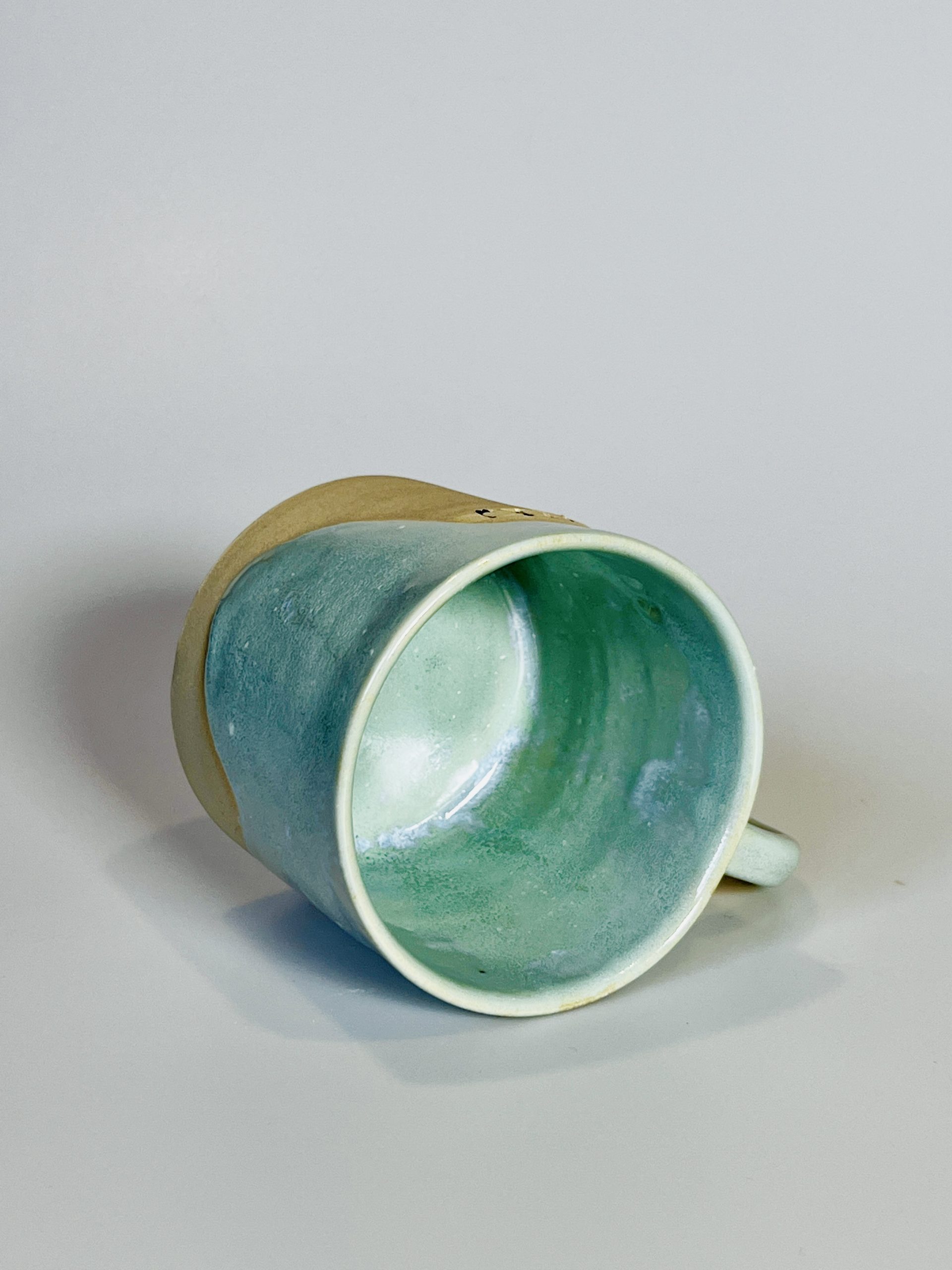 Miętowe szkliwo z delikatnymi, naturalnymi przejściami i jasną gliną na dole wygląda świeżo i lekko, a zielonkawe wnętrze ma piękny, ręcznie szkliwiony efekt. Każdy egzemplarz jest unikatowy.